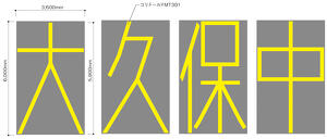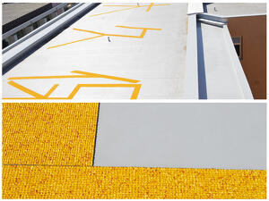 防滑性床ビニルシート「コリドール」を用いて文字部分を制作。防水層を形成するリベットルーフSGM上に敷設しています。