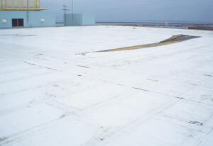 東日本大震災で保護コンクリートにクラックが入った事や、既存ゴムシート防水のジョイントに剥がれなどの不具合があったため、防水改修工事が行われました。 冷凍庫であり、室内の温度を低く保つ必要があったため、遮熱性能に期待され「リベットルーフCOOL」が採用されました。 (現場レポート27号に掲載)