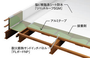 通常、屋上防水が完成した後に階下の作業に入ります。この場合、屋上防水ができる3週間後まで階下の作業ができないというデメリットがありました。 本事例で採用されたNPシステム(耐火断熱サンドイッチパネル工法)の場合、耐火断熱サンドイッチパネルを敷設し、接合目地部にアルミテープを貼付け雨養生を行うことで階下の作業ができ、工期の短縮が図られるというメリットが生じました。本事例では、屋上防水作業を始めた後、4日後から階下の作業に入れました。 (現場レポート26号に掲載)