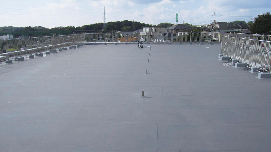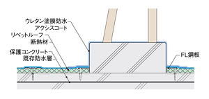 塩ビ樹脂系防水シート「リベットルーフ」防水システムと、ウレタン塗膜防水「アクシスコート」防水システムが併用された事例