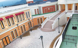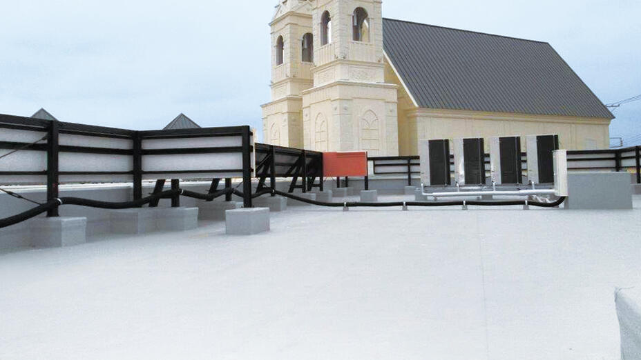 地中海モナコを想わせる街並みを模した特徴的な建築。意匠性を重視する案件の屋上防水にリベットルーフが採用された事例