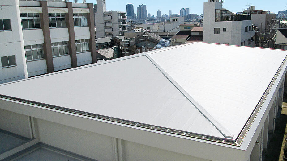 本事例では太陽光高反射シート「リベットルーフCOOL」を用いた断熱防水システムによる改修がなされました。高反射シートと外断熱工法の相乗効果によって、夏期における建物への熱流入、冬期における建物外への熱流出を低減し、屋内環境の改善が期待できる点が評価されました。 (現場レポート30号に掲載)