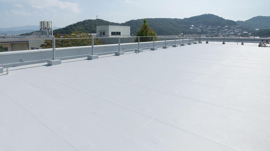 かぶせ工法で短工期を実現。 塩ビシート複合工法で、さまざまな役物まわりを納まりよく仕上げた事例。