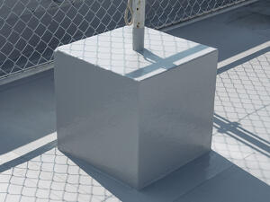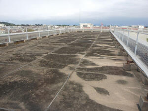 本物件では、既存防水層を撤去せずに、短工期かつ下地に対して高い追従性をもつリベットルーフ「かぶせ工法」が採用されました。屋上部分には役物の数が多く、旗あげポールやフェンス基礎などをどのように納めるかが課題でした。役物まわりは複雑な形状にも高い対応力をもつウレタン系塗膜防水材「アクシスコート」と塩ビシート防水を併用する「塩ビシート複合工法」を採用することで、納まり良く仕上げることが出来ました。 (現場レポート31号に掲載)