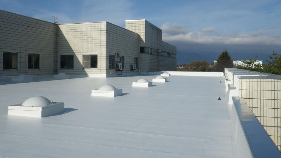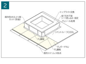 下地をフラットにするために、まず既存ステンレス防水のハゼに断熱材(FLボードNU)を敷設し、下地調整と同時に高断熱化を行いました。また、太陽光高反射シート「リベットルーフCOOL」をあわせて使用することで、夏季における室内の熱流入を抑制し、空調負荷の軽減に貢献するなど、環境に配慮した仕様が採用されました。