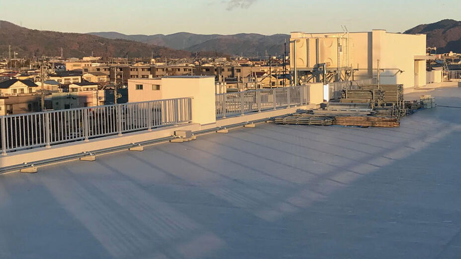リベットルーフでの防水改修では、既存防水下地の破壊・撤去をせずに、上からリベットルーフをかぶせて新しい防水層を構築する「かぶせ工法」で施工します。そのため、下地処理による廃材が必要最低限ですみ、同時に工程を短縮することが可能です。 (現場レポート31号に掲載)
