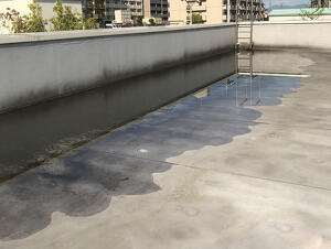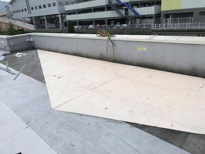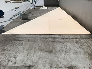 片勾配の屋根形状で側溝がなく、ドレン間に大きな水たまりが発生していました。シート防水の上に水たまりが出来ると、シートが破断した際に浸水するなど、漏水のリスクが高くなります。ドレンに向かって水が流れるように断熱材で勾配を設けることで、水たまりを軽減しました。 (現場レポート31号に掲載)