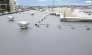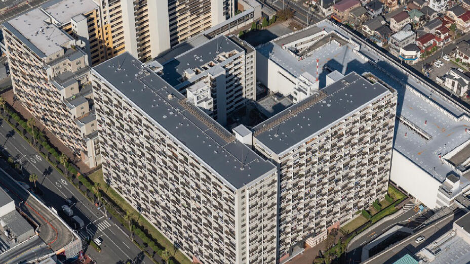 高耐久シート「リベットルーフHP」で、 沿岸地域の高層マンションを 全面防水改修した事例。
