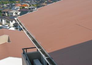 防水改修時に「意匠性を重視したい」という要望に対して、特注色で応えた事例です。塩ビ樹脂系シート防水「リベットルーフ」は、屋根の意匠性向上のため、特注色を用意することが出来ます。さらに「リベットルーフ」相互のジョイント部に使う「FLシール」も特注色を用意。屋根をブラウン色にする事で、外壁の配色にもマッチした美しい外観となりました。 (現場レポート32号に掲載)