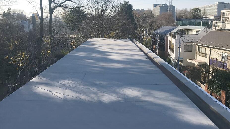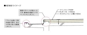 築40年を超える職員宿舎をリノベーションする際の課題の一つが、「省エネルギー化」でした。実現するために屋根の高断熱化がなされました。目標の省エネ基準を達成するためには、屋根上の断熱材は厚さ100mmを設ける必要があり、これを塩ビ樹脂系シート防水「リベットルーフ」で納めました。 (現場レポート32号に掲載)