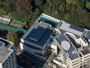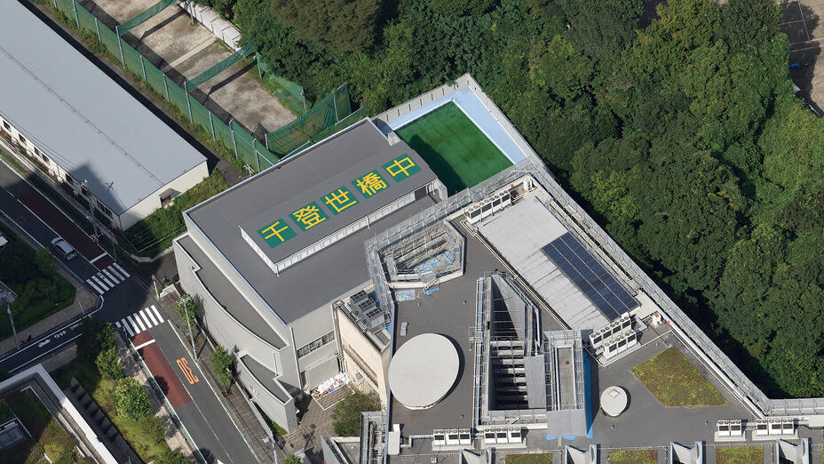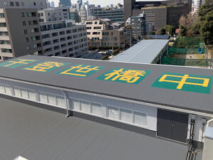 体育館棟の屋上防水改修に、リベットルーフ「ヘリサインシステム(フィルム仕様)」が採用されました。リベットルーフ防水システムで防水改修を行った後、シートの上に再帰性反射フィルムを貼り付ける事でヘリサインとしています。 (現場レポート35号に掲載)