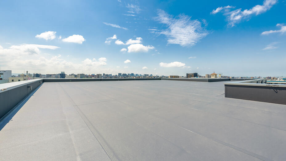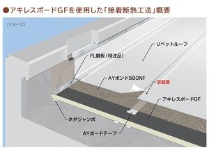 新築デッキコンクリート下地に、硬質ウレタンフォーム「アキレスボードGF」を使用したリベットルーフ「接着断熱工法」が採用されました。本工法は、接着剤を用いて断熱材を下地に固定し、その上にリベットルーフを接着工法で納める防水システムです。コンクリートスラブに下穴を開ける数を減らせるため、近隣への騒音対策が必用な場合などに有用です。 (現場レポート35号に掲載)