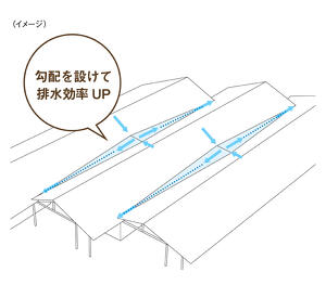 切妻形状が3連続する屋根にリベットルーフ防水システムが採用。