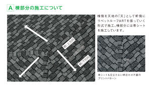 本事例は、大型マンションの勾配屋根を専用防水改修シート「リベットルーフART」を用いて改修した事例です。あらかじめプリントされた柄によって、マンションの意匠性維持に貢献できました。なお、ルーフバルコニー部分は、リベットルーフSGMを用いたアンカー固定の防水層にコリドールを施工しています。 (現場レポート37号掲載)