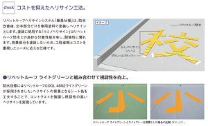 リベットルーフヘリサインシステム「簡易仕様」は、防水改修後、文字部分だけを専用塗料で塗装しヘリサインとします。塗装に使用する「ルミノヘリサイン」はリベットルーフ防水との良好な付着性能を有し、耐候性に優れます。背景部分を塗装しないため、工程省略とコストを重視したニーズに応える仕様です。