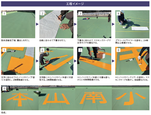 小学校の屋上にリベットルーフヘリサインシステム「簡易仕様」が採用されました。本工法はリベットルーフ防水施工後、文字部分だけを専用塗料で塗装し、ヘリサインとするコスト効率に優れた工法です。 (現場レポート38号掲載)
