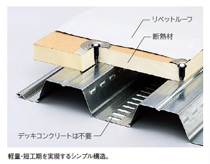 採用された「LCS工法」は、耐火デッキプレート上に断熱材を敷設し、リベットルーフ防水を施工する金属屋根専用の工法です。デッキプレートにコンクリートを打設することなく、シンプルな構造により、短工期で軽い屋根を実現します。屋根の重量を抑えることで建物の構造部材を減らし、工数やコスト削減ができるメリットもあり、大型倉庫に最適な防水工法です。