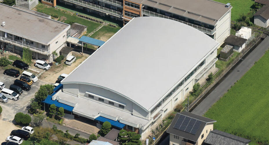 小学校の体育館をLCS-R工法を用いて防水改修を行った事例です。ボールト形状の瓦棒屋根に対して、断熱材を2枚重ねる高断熱仕様が採用されました。大屋根から軒先側溝部まで1枚の大きなシートで包み込むことで水密性の高い防水層を構築しています。