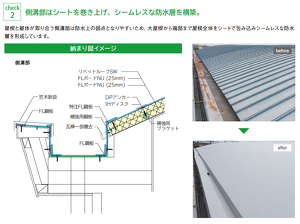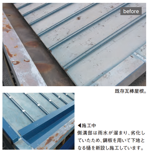 屋根と躯体が取り合う側溝部は防水上の弱点となりやすいため、大屋根から端部まで屋根全体をシートで包み込みシームレスな防水層を形成しています。