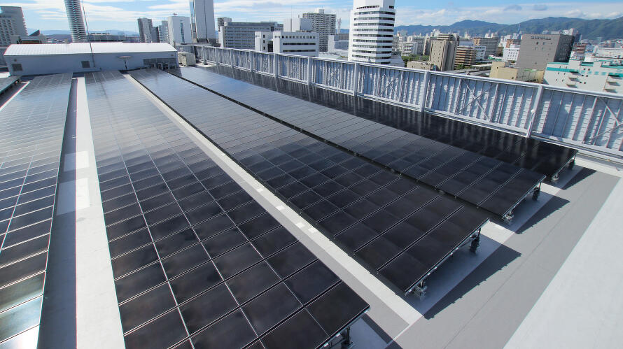 防水施工としてはリベットルーフSWを用いたアンカー固定工法が採用されました。屋上に設置された太陽光モジュールのメンテナンス時などに防水層上を歩けるようにするため、歩行部分には防滑性床ビニルシート「コリドール」を敷設しています。 (現場レポート27号に掲載)
