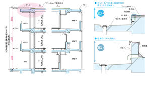 パラペットを無くす事によって(1)住宅階の階高向上(2)コストダウン(パラペット、横引きドレン、アルミ笠木など)(3)工期短縮などのメリットが生じました。 塩ビ樹脂系防水シートだからこそ、パラペットのない、すっきりした屋上を実現できたと言えます。 (現場レポート26号に掲載)