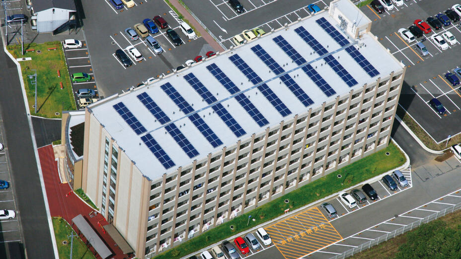 建物の高さ制限に配慮し、パラペットを超えない太陽光設置ができる点が評価された「太陽光固定システムエネブリッド」の事例。