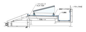 耐火断熱サンドイッチパネルを構造体として、そのうえに防水施工を行う「NPシステム接着工法」が採用されました。 また、前述の防水システム導入とあわせて、「連結ディスクADC」を用いた太陽光固定システム「エネブリッド」も採用されています。 (現場レポート26号に掲載)