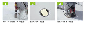 防水仕様としては、太陽光高反射シート「リベットルーフCOOL」を用いたアンカー固定断熱工法が採用されました。 その後、リベットルーフと断熱材のコア抜きを行い、断熱アダプターを設置。「連結ディスクADC」の固定を行いました。 断熱アダプター設置を行う事で、モジュールや架台の荷重による断熱材の沈み込みを防ぎ、適切な太陽光設置ができます。 (現場レポート26号に掲載)