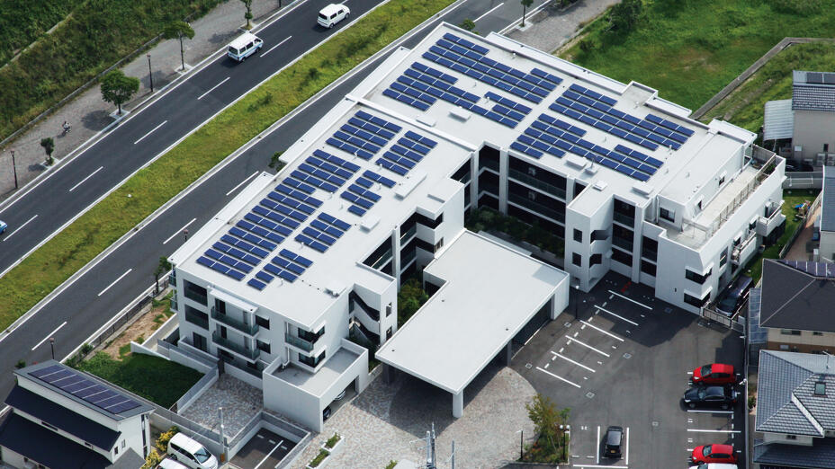 マンションの新築工事において、接着工法による「リベットルーフ」防水システムとあわせて、太陽光固定システム「エネブリッド」が導入された事例