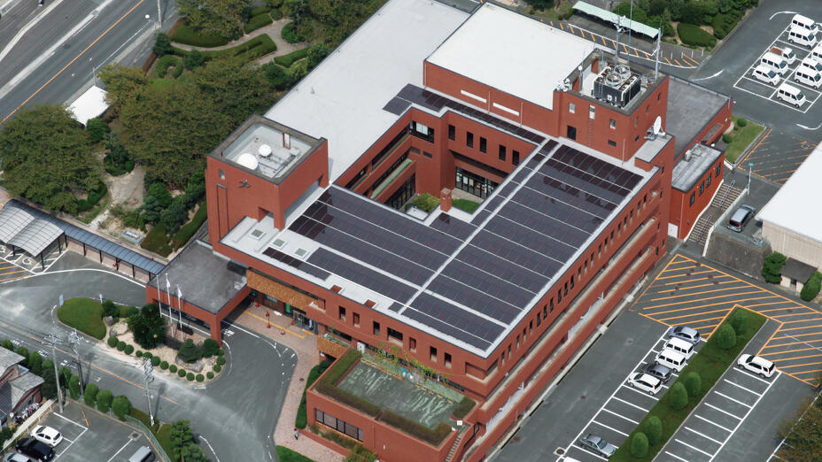 自治体庁舎の防水改修工事に「リベットルーフ」防水システムが導入され、あわせて「連結ディスクADC」を用いた太陽光固定システム「エネブリッド」が採用された事例