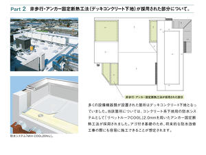| 仕様・規模 | アンカー固定断熱工法 Part1:MIHFD-COOL20NU 約5500m2 Part2:MIH-COOL20NU 約1350m2 Part3:FFD-COOL20MS 約990m2 |