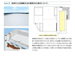 塩ビ樹脂系防水シート「リベットルーフ」が耐候性や耐久性などに優れる防水材であるという「製品」としてのメリット。そして、断熱防水システムとして軽量な屋根構造を実現できるということも評価され、採用されました。 施工条件に応じて異なる仕様を提案し、多様なニーズに応えた事例です。 (現場レポート30号に掲載)