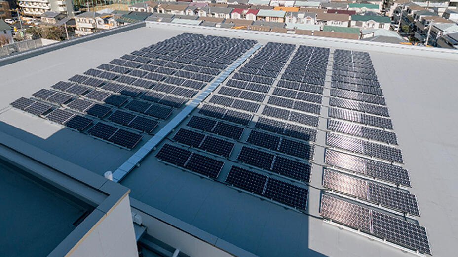 耐火断熱サンドイッチパネル「FLボードNP」上に、太陽光発電システムを設置した事例。