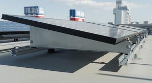 「FLボードNP」を使用した防水システムに、「連結ディスクADC」を用いて太陽光モジュールを設置した事例です。架台基礎である「連結ディスクADC」は、母屋に対して留め付ける※ことで、強固に太陽光システムを固定することが可能。架台には「EBベースレール」が用いられており、モジュールの開閉が出来るため、メンテナンスも行いやすいといったメリットがあります。 ※FLボードNPと連結ディスクADCの設置には母屋間隔の計算が必要です。 (現場レポート32号に掲載)