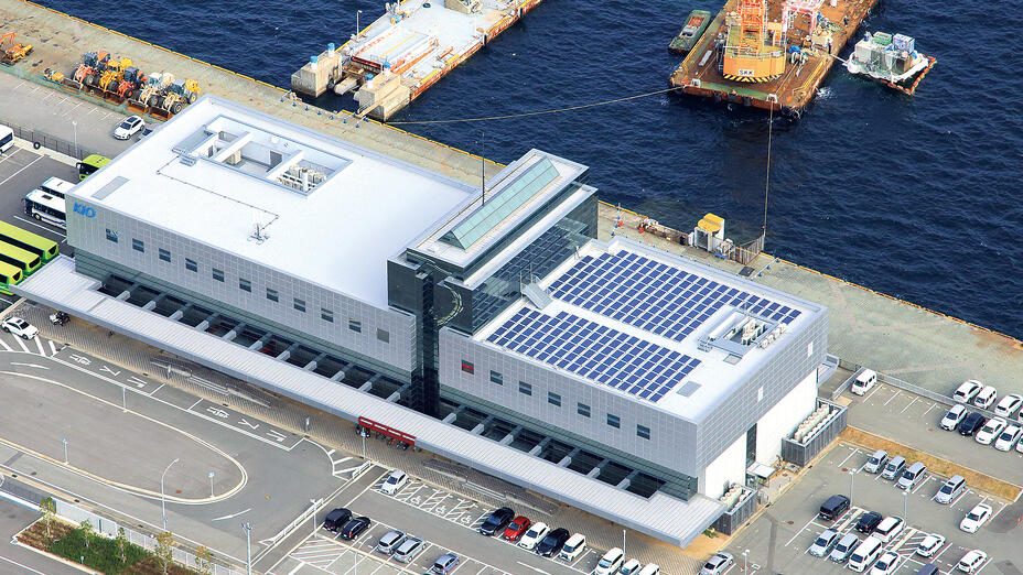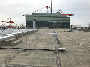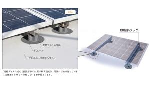 本事例では、大型台風の直撃を受けても、太陽光モジュールや防水層が飛散しないような仕様が求められました。そこで、屋根全体をリベットルーフ防水システム「強風仕様」で改修。IHディスクを密にする事で、下地とリベットルーフを強固にファスニングしています。次に、防水一体型基礎「連結ディスクADC」を使用した「EBディスク仕様」で太陽光パネル用架台基礎を躯体に対して強固に固定。確かな水密性と固定強度の確保を両立できる「EBディスク仕様」が評価され採用にいたりました。 (現場レポート33号に掲載)