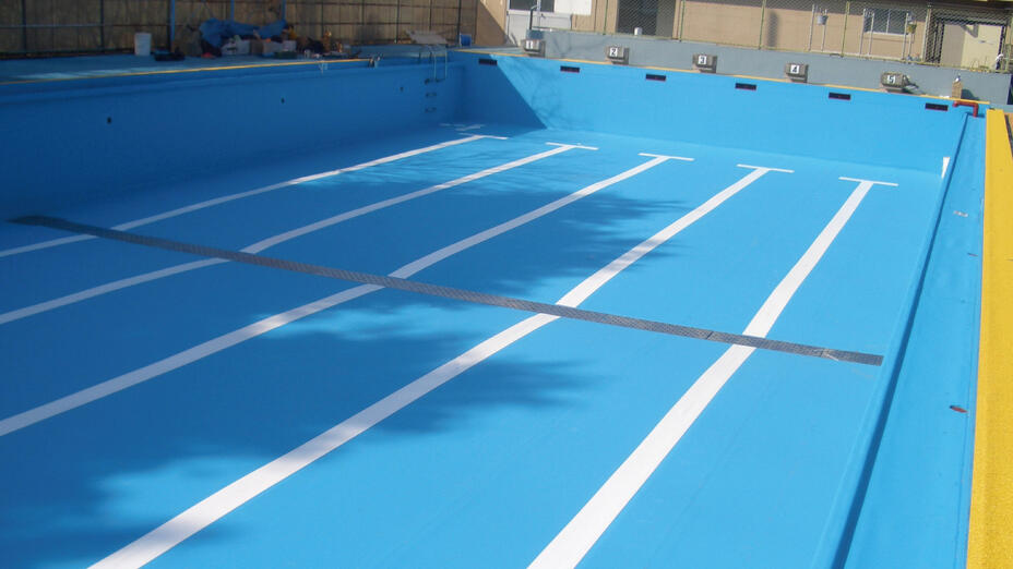 鉄製のプール本体部分を「アクアキューブ」防水システムによって改修した事例です。コースレーンなどの改修も行っています。 (現場レポート26号に掲載)