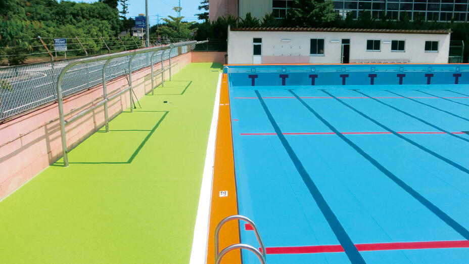東日本大震災の影響で下地コンクリートが隆起しており、既存の塗装が剥がれて利用者がケガをする懸念がありました。「アクアキューブ」は、剥がれの心配がなく、下地の影響を受けにくい点が評価され、採用に至りました。プールサイドも同様に、下地の影響を受けにくアンカー固定工法となっています。 (現場レポート29号に掲載)