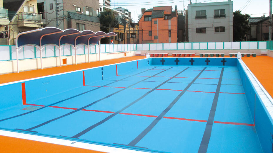 アルミ製プールでも施工が可能である点。塗装防水からシート防水へ変更することで、塗装の剥がれによる生徒のケガを防げる点などが評価され、「アクアキューブ」防水システムが採用されました。 (現場レポート29号に掲載)