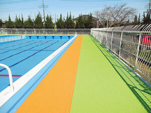 | 仕様・規模 | プール本体:アンカー固定工法 M-PG15 約450m2 プールサイド:アンカー固定工法 M-YMX 約300m2 |