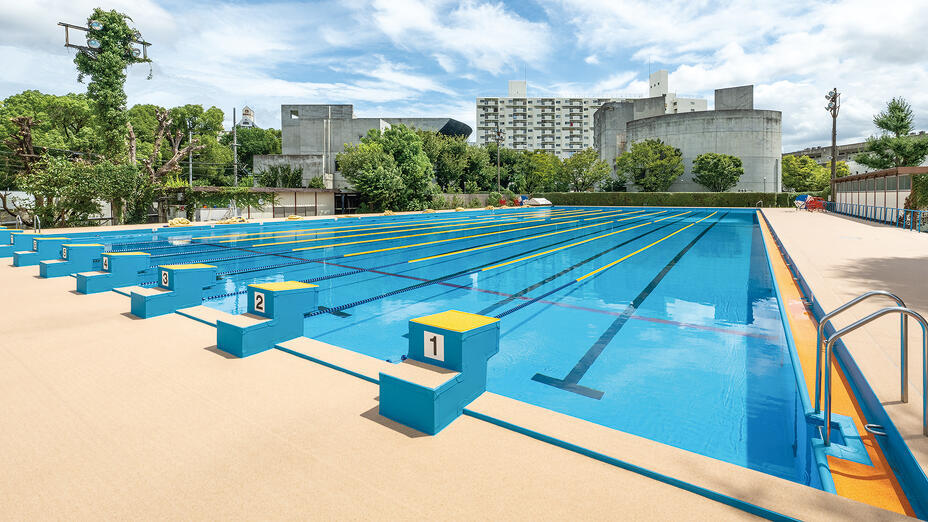 経年劣化した50mの巨大プールをプール防水システム「アクアキューブ」で改修。