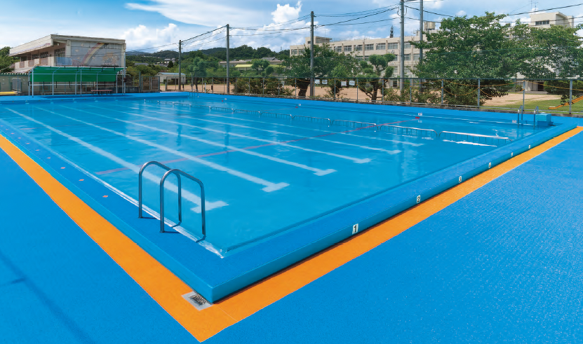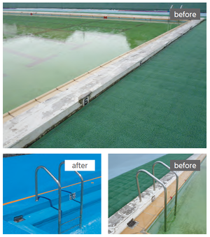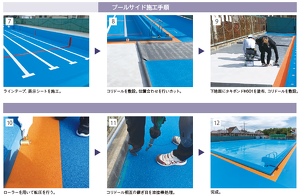 アクアキューブによる防水改修事例。 プールサイドの意匠性と快適な歩行を両立。