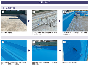 プール防水システム「アクアキューブ」で防水改修を行った事例です。本システムは塗装で生じるハガレやひび割れの心配がなく、長期間にわたってプールを安全に使用できます。プールサイドは防滑性ビニル床シート「コリドール」が採用されており、意匠性と安全性を両立させた仕上がりとなっています。 (現場レポート38号掲載)