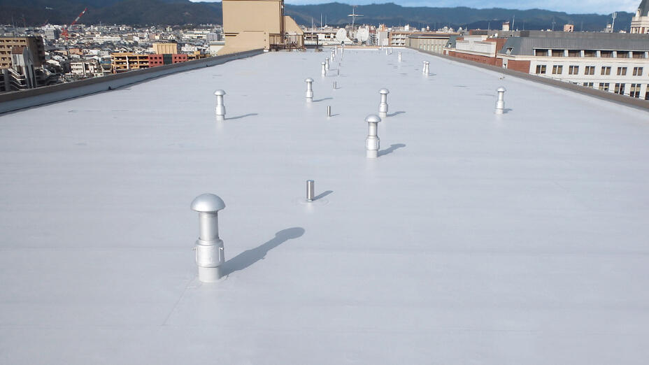 本事例では、改修時に既存防水層を撤去せずに「かぶせ工法」にて施工が可能であること。そして、ルーフバルコニーなどについては防滑性床ビニルシート「コリドール」を敷設し、意匠性が高められることが評価されました。