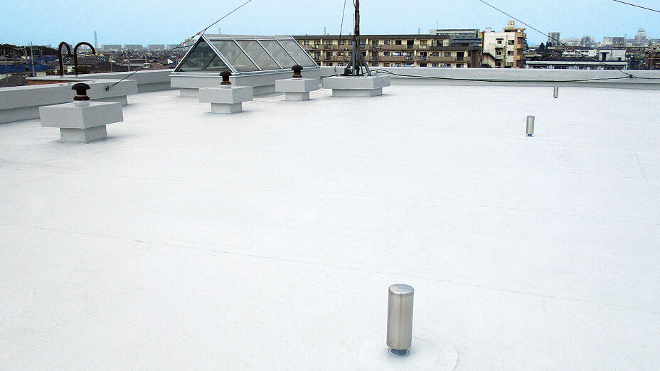 平場部は「リベットルーフ」役物廻りなどは「アクシスコート」。塩ビ樹脂系シート防水とウレタン塗膜防水の施工事例