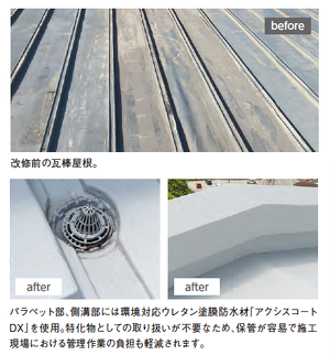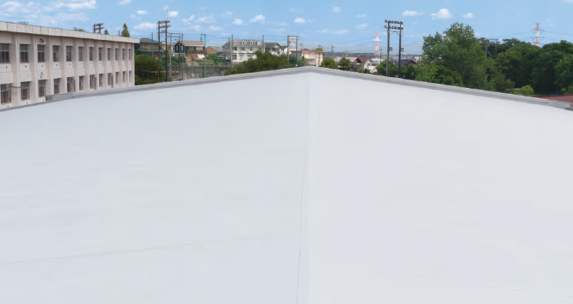 中学校体育館の瓦棒屋根に「LCS-R工法」が採用されました。本工法は既存防水層に断熱材を敷設し、リベットルーフを施工する外断熱工法です。太陽光高反射シート「リベットルーフCOOL」と組み合わせることで、居住性が向上するとともに、温度変化による建物への負荷を軽減。 部分的に環境対応ウレタン塗膜防水材「アクシスコートDX」を併用し、環境に配慮した防水改修が行われました。