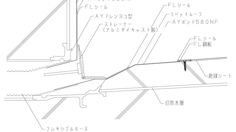 横型ドレン改修納まりの例1 種別 : JWWファイル download DWGファイル download PDFファイル download カタログ 総合カタログ : 134 リベットルーフカタログ : 58 リベットルーフ防水改修カタログ : 29