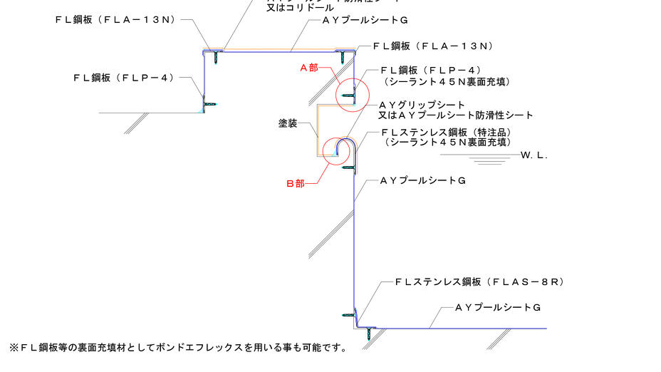 アクアキューブ プール防水納まりの例 短辺方向 種別 : JWWファイル download DWGファイル download PDFファイル download カタログ 総合カタログ : 143 アクアキューブカタログ : 25