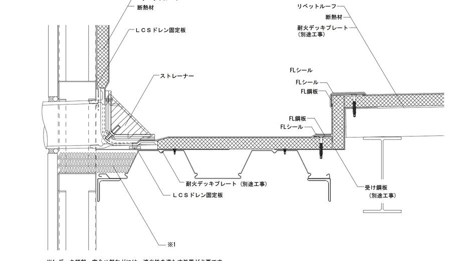 横型ドレン部納まりの例(LCS工法) 種別 : JWWファイル download DWGファイル download PDFファイル download カタログ リベットルーフカタログ : 62 LCSカタログ(新築用) : 16
