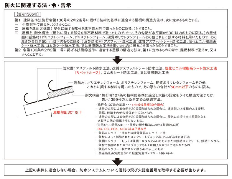 アーキヤマデでは、「告示1365号」で例示された仕様にあてはまらない、数多くの防水システムについても飛び火認定の取得を進めています。