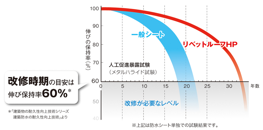 人工促進暴露試験において30年相当経過しても、伸び保持率が60%を上回っており(防水材として要求される適切な柔軟性を有している)、防水機能を十分保持していると評価しています(下図参照)。